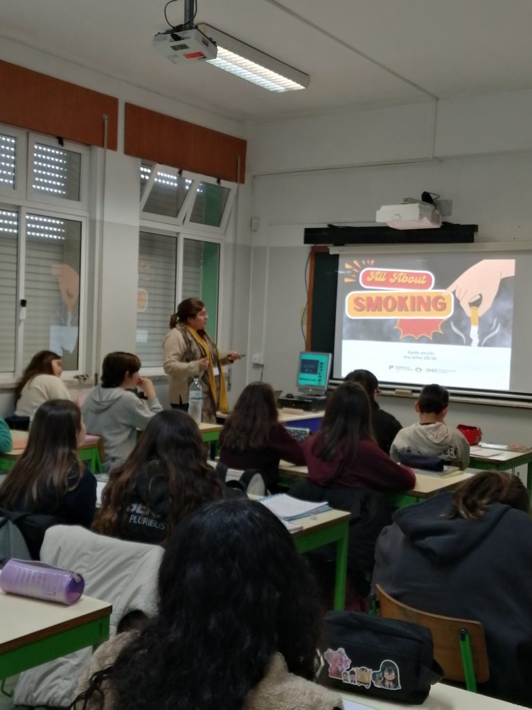 Esta sessão teve como principal objetivo informar e consciencializar os alunos para os riscos associados ao consumo de tabaco, nomeadamente os seus efeitos nocivos na saúde física e mental, o impacto no sistema respiratório e cardiovascular, bem como as consequências a longo prazo, como o desenvolvimento de doenças graves. Foram ainda abordadas questões relacionadas com a dependência da nicotina, a influência do grupo de pares e a importância de adotar estilos de vida saudáveis desde cedo.